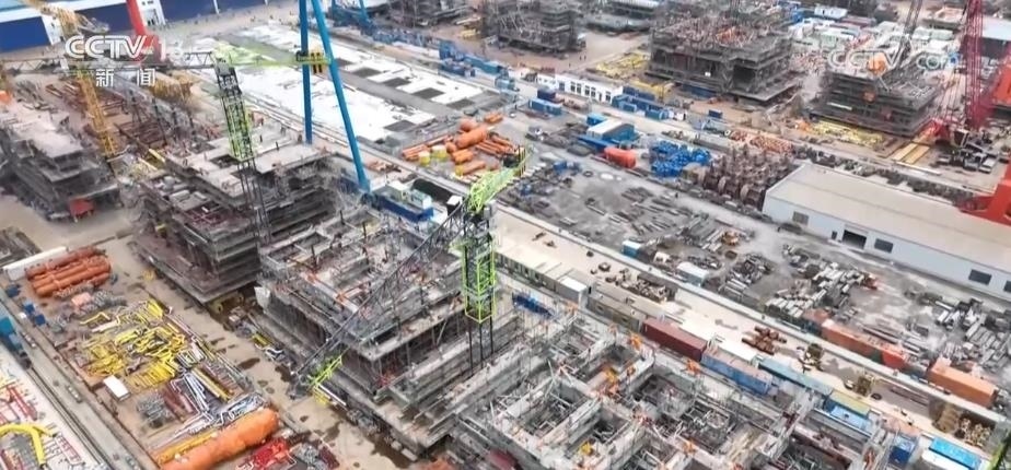 這些大家伙,都是世界技術(shù)比較領(lǐng)先的一些海工裝備。通過航拍的鏡頭,給大家展現(xiàn)一下,最遠(yuǎn)的是圓筒形超深水鉆探平臺。因?yàn)樗耐庑问仟?dú)特的圓筒型設(shè)計(jì),所以它的抗風(fēng)浪性、作業(yè)水深的能力非常得好,技術(shù)指標(biāo)創(chuàng)下多項(xiàng)世界第一。這家企業(yè),一共向國外交付了6艘同類型的產(chǎn)品。