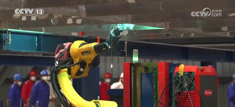 記者來到這個剛剛建成不久的智能化造船車間,一臺臺焊接機(jī)器人,正在自主完成作業(yè)。