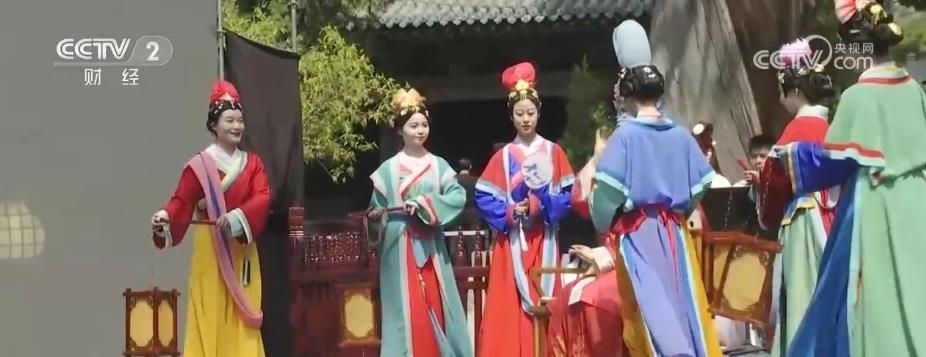 在晉祠的標(biāo)志性建筑圣母殿前,一場場穿越古今的表演登臺亮相?!稌x祠十二時(shí)辰》由晉祠講解員自行編排而成,生動還原了圣母殿內(nèi)人物的一天。從服飾裝扮到生活起居,她們用舞蹈讓雕塑“活”了起來,也使游客從別樣的角度領(lǐng)略了圣母殿折射出的文化魅力。