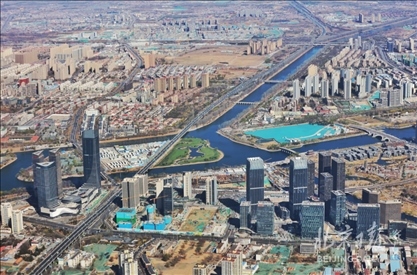 今天,古塔腳下,新城崛起。登臨五河交匯處的高樓觀景平臺,憑欄眺望,只見運(yùn)河水道兩側(cè),現(xiàn)代化樓宇鱗次櫛比。這里是城市副中心運(yùn)河商務(wù)區(qū)所在地,20679家注冊企業(yè)入駐、包括國家級綠色交易所在內(nèi)的一批重大項(xiàng)目相繼落戶,為其注入勃發(fā)生機(jī)。