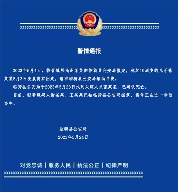 ·山西臨猗縣公安局發(fā)布警情通報:10歲男孩失蹤身亡,嫌犯為生母和繼父。兩人曾流淚拍尋人視頻。
