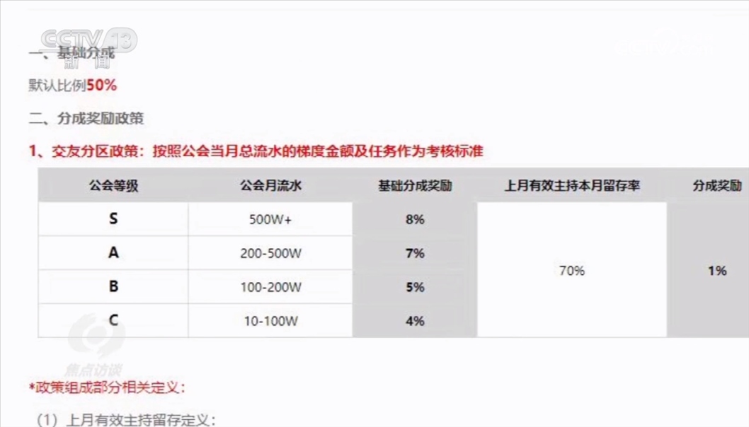 主播得到的打賞,平臺(tái)和經(jīng)紀(jì)機(jī)構(gòu)都會(huì)參與分成。一般來(lái)說(shuō),平臺(tái)要首先分走50%的打賞費(fèi)用,剩下的由主播和經(jīng)紀(jì)機(jī)構(gòu)來(lái)分。從某平臺(tái)與主播經(jīng)紀(jì)公司的后臺(tái)約定中可以看出,當(dāng)月總流水的梯度金額及任務(wù)作為考核。經(jīng)紀(jì)機(jī)構(gòu)月流水超過(guò)500萬(wàn)元,至少可以額外拿到8%的獎(jiǎng)勵(lì)。在這種制度的激勵(lì)下,就推動(dòng)經(jīng)紀(jì)公司和主播想方設(shè)法爭(zhēng)取更高額度的打賞。