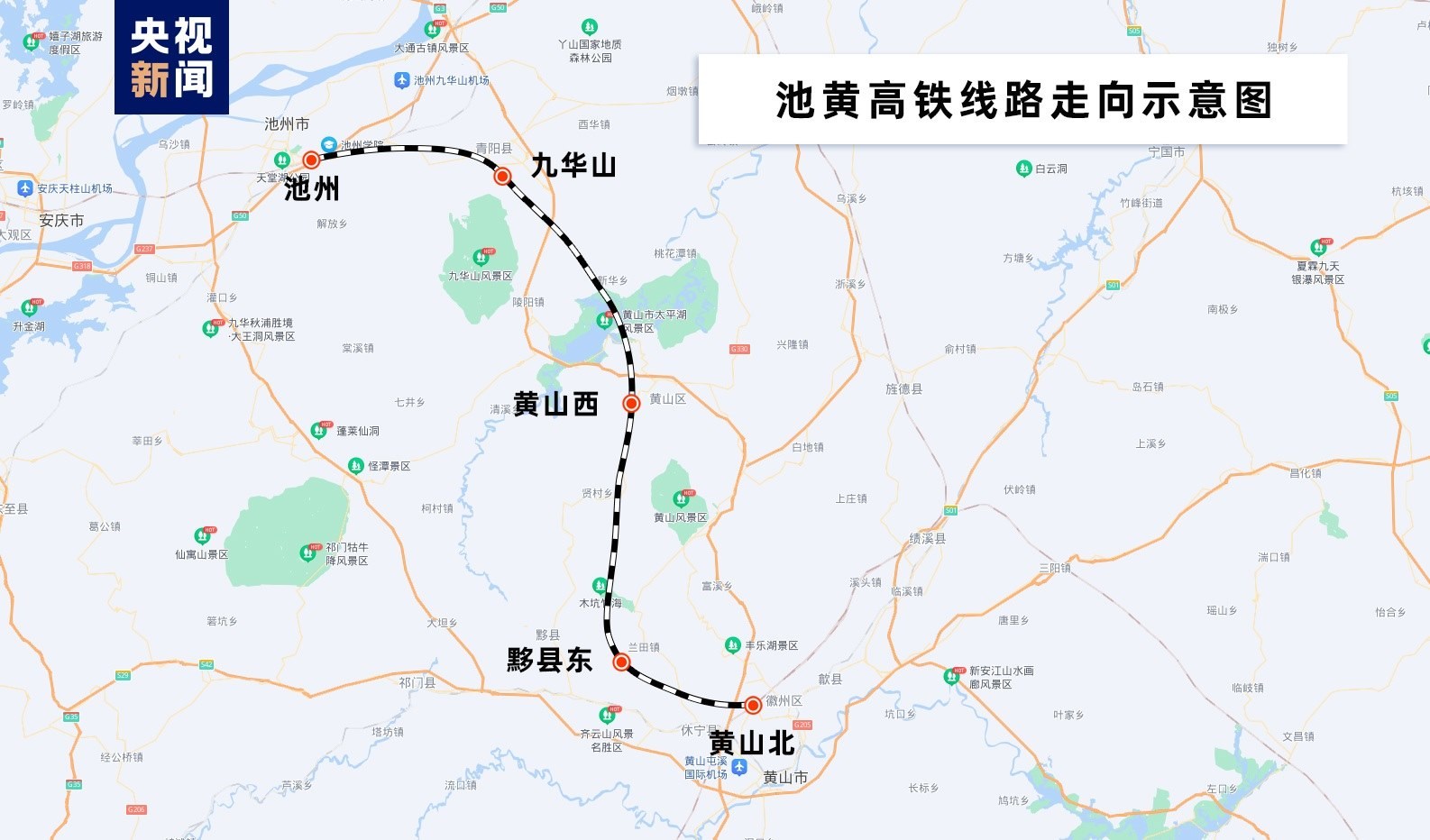 池黃高鐵是武漢至杭州高速鐵路通道的重要組成部分,線路起自池州站,至黟縣東站與在建昌景黃高鐵共站并線至黃山北站,新建正線長約125公里,設計時速350公里,全線隧道34座,隧道占比60.8%,總投資額183.7億元,全線設池州、九華山、黃山西、黟縣東、黃山北等5座車站。池黃高鐵通車后,將成為串聯起黃山、九華山的黃金旅游線路。