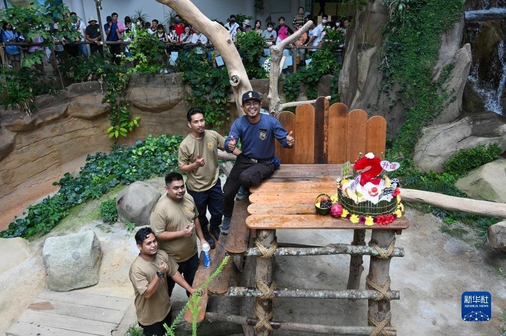 5月31日,在馬來西亞吉隆坡附近的馬來西亞國家動物園,大熊貓飼養(yǎng)員阿克邁勒(右)和他的團(tuán)隊(duì)與“升誼”的生日蛋糕合影。