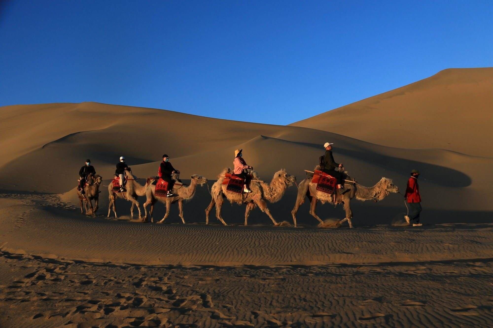 甘肅敦煌:游客騎駱駝?dòng)斡[鳴沙山