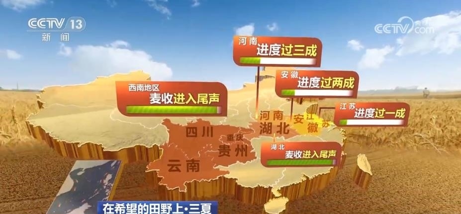 農(nóng)業(yè)農(nóng)村部小麥機(jī)收調(diào)度顯示,目前,全國已收冬小麥面積7500多萬畝,麥?zhǔn)者M(jìn)度過兩成。其中,西南地區(qū)、湖北麥?zhǔn)者M(jìn)入尾聲;河南進(jìn)度過三成、安徽進(jìn)度過兩成、江蘇進(jìn)度過一成。