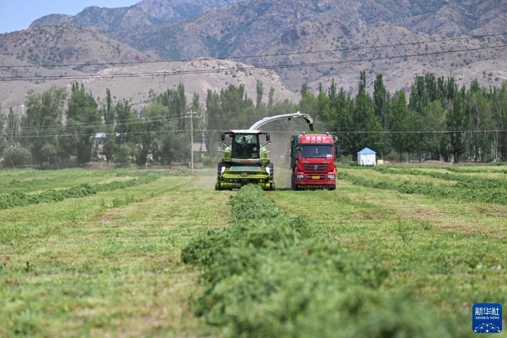 6月4日,在土默特左旗國家現(xiàn)代農(nóng)業(yè)示范區(qū)內(nèi),機械車輛在收割苜蓿。