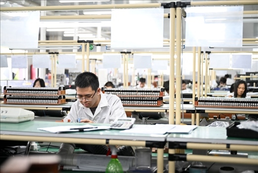 工作人員在天津宜科自動(dòng)化股份有限公司傳感器生產(chǎn)車間內(nèi)工作。新華社記者 趙子碩 攝