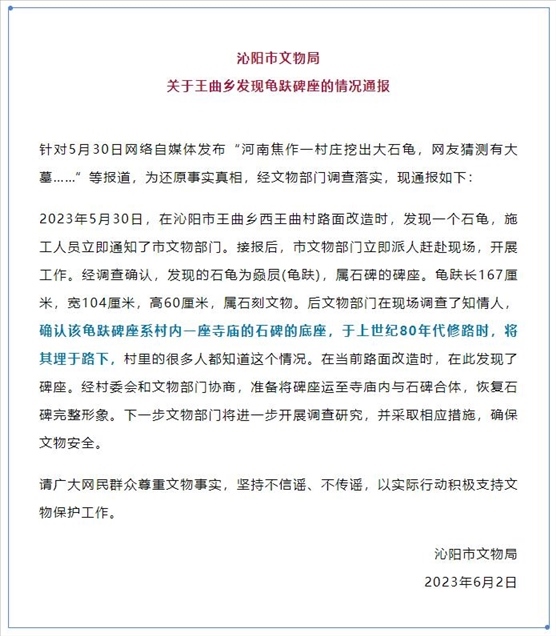 ·河南焦作一村莊修路挖出大石龜,沁陽市文物局發(fā)布情況通報(bào):上世紀(jì)80年代修路時(shí)埋于路下。