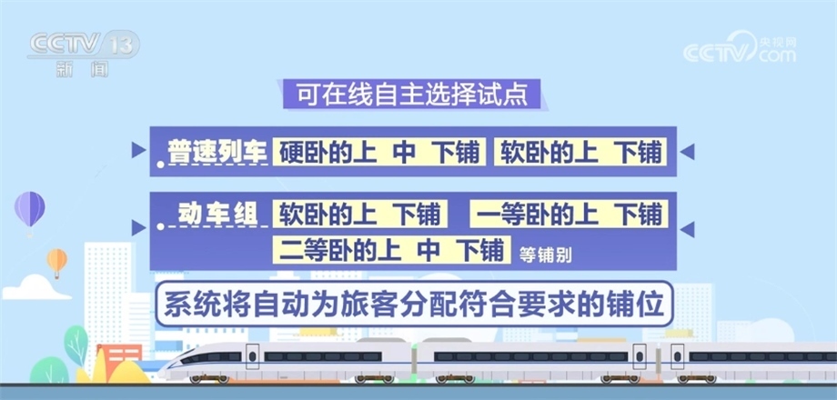 如剩余鋪位無法滿足選鋪需求,系統(tǒng)將隨機(jī)分配鋪位,旅客可根據(jù)自身情況選擇接受或者取消。旅客線下購(gòu)票仍可自主選擇鋪別。有關(guān)在線選鋪服務(wù)試點(diǎn)車次詳細(xì)信息,旅客可通過鐵路12306網(wǎng)站查詢。