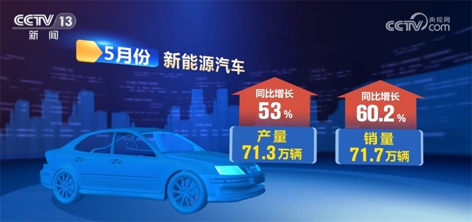 其中,新能源汽車產(chǎn)銷量分別完成71.3萬輛和71.7萬輛,同比分別增長53%和60.2%,市場占有率達(dá)到30.1%。在出口方面,5月份,全國汽車出口38.9萬輛,同比增長58.7%。