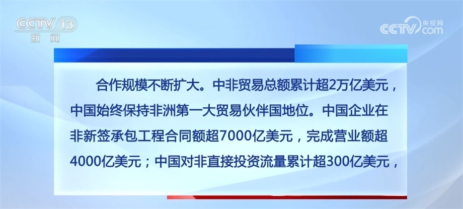 合作規(guī)模不斷擴(kuò)大。中非貿(mào)易總額累計(jì)超2萬億美元,中國始終保持非洲第一大貿(mào)易伙伴國地位。中國企業(yè)在非新簽承包工程合同額超7000億美元,完成營業(yè)額超4000億美元;中國對非直接投資流量累計(jì)超300億美元,已成為非洲第四大投資來源國;向非洲國家派遣醫(yī)療隊(duì)員約9000人次,提供研修培訓(xùn)名額超過10萬個(gè),一批基礎(chǔ)設(shè)施和社會(huì)民生項(xiàng)目相繼建成。
