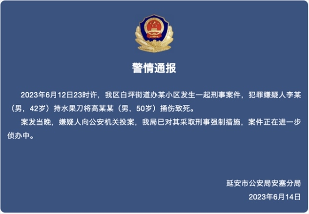 ·陜西延安一男子持水果刀將人捅傷致死,警方通報。