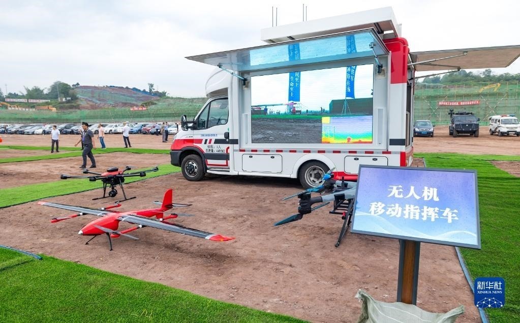 這是演練現(xiàn)場(chǎng)展示的無(wú)人機(jī)移動(dòng)指揮車(6月14日攝)。