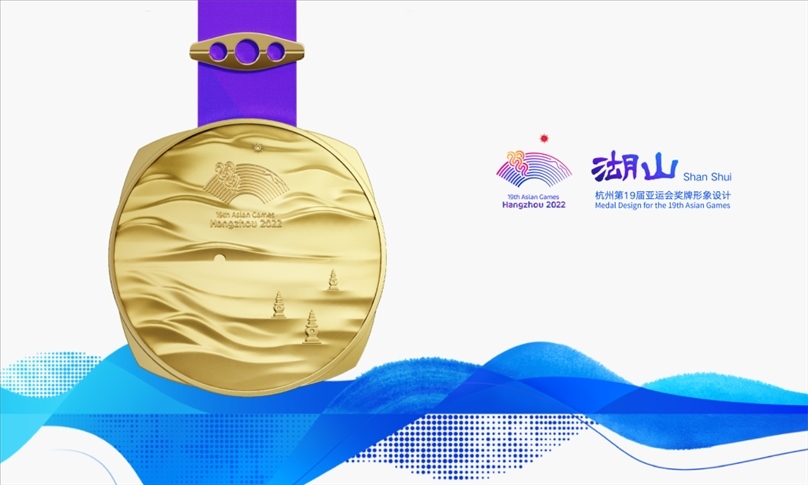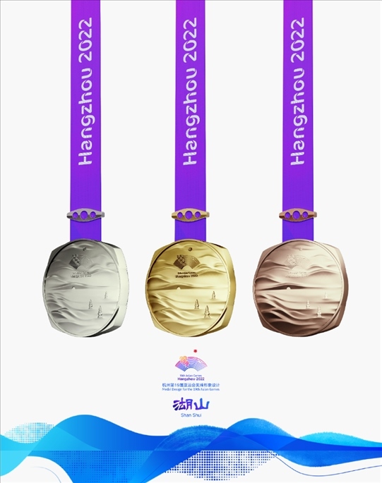 獎牌取名為“湖山”,它的設(shè)計(jì)靈感源自五千年良渚文明,展示中國江南文化,呈現(xiàn)杭州山水景觀。在亞運(yùn)會獎牌設(shè)計(jì)中首次將方形玉琮和圓形獎?wù)氯跒橐惑w,其中獎牌正面用凸出的線條勾勒出“三面云山一面城”的杭城畫卷,湖水漣漪,山巒起伏;獎牌背面,形似方形印章,寓意運(yùn)動員們在杭州亞運(yùn)會上留下美好的印記。