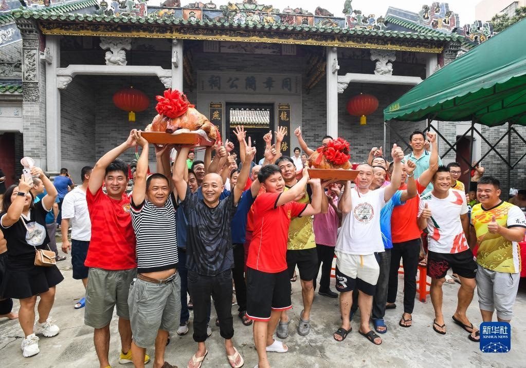 6月15日,2023年車陂龍舟競(jìng)渡第一名“范陽簡(jiǎn)”龍船會(huì)的成員們?cè)诩异羟疤е?jiǎng)品燒豬慶祝。