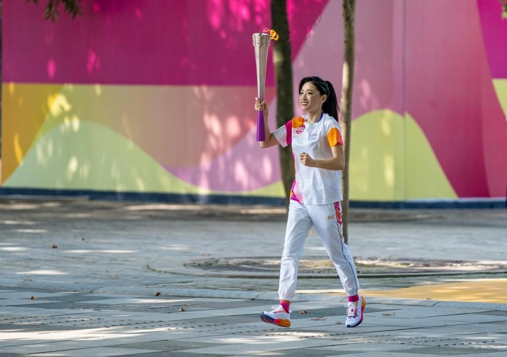 9月8日,火炬手羅雪娟在火炬?zhèn)鬟f中。當日,杭州亞運會火炬?zhèn)鬟f在杭州西湖涌金公園廣場啟動,共有106棒火炬手參與當日傳遞。新華社記者孫非 攝