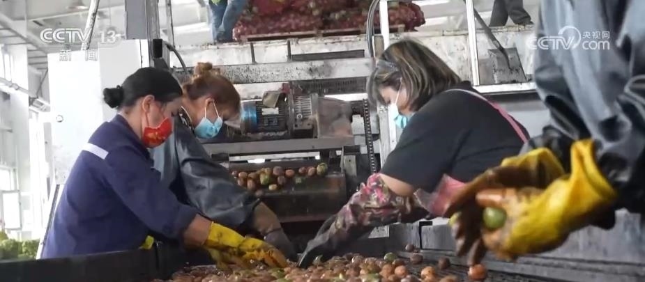 總臺(tái)記者 卜鵬:這里是位于新疆阿克蘇地區(qū)溫宿縣的一處核桃種植基地,這段時(shí)間正是當(dāng)?shù)睾颂页墒觳烧募竟?jié)。這些核桃樹上,一顆顆青綠渾圓的核桃掛滿枝頭,而在核桃樹底下,當(dāng)?shù)氐墓r(nóng)們正在抓緊撿收被抖落的核桃。為什么說是被抖落的核桃而不是被敲落的核桃?那是因?yàn)?,在?dāng)?shù)匾恍┓N植面積比較大的核桃基地里,當(dāng)?shù)氐墓r(nóng)會(huì)選擇利用農(nóng)業(yè)機(jī)械輔助抖動(dòng)樹干的方式來采收核桃。采收的時(shí)候,果農(nóng)們會(huì)把繩索捆綁在核桃樹上,負(fù)責(zé)機(jī)械操作的師傅會(huì)根據(jù)樹枝的粗細(xì)來掌握和控制抖動(dòng)的力度,這樣就能夠避免因?yàn)橛昧^猛而對(duì)樹枝產(chǎn)生傷害。經(jīng)過機(jī)器的搖擺,核桃就會(huì)接二連三落在地上,相比于人工采摘,機(jī)械采摘的方式效率會(huì)更高。