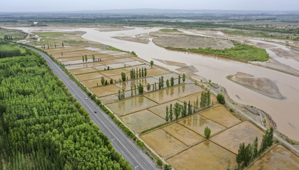 流經(jīng)寧夏青銅峽市境內的黃河,滋潤著岸邊水稻和各種植被(無人機照片,5月25日攝)。新華社記者馮開華 攝