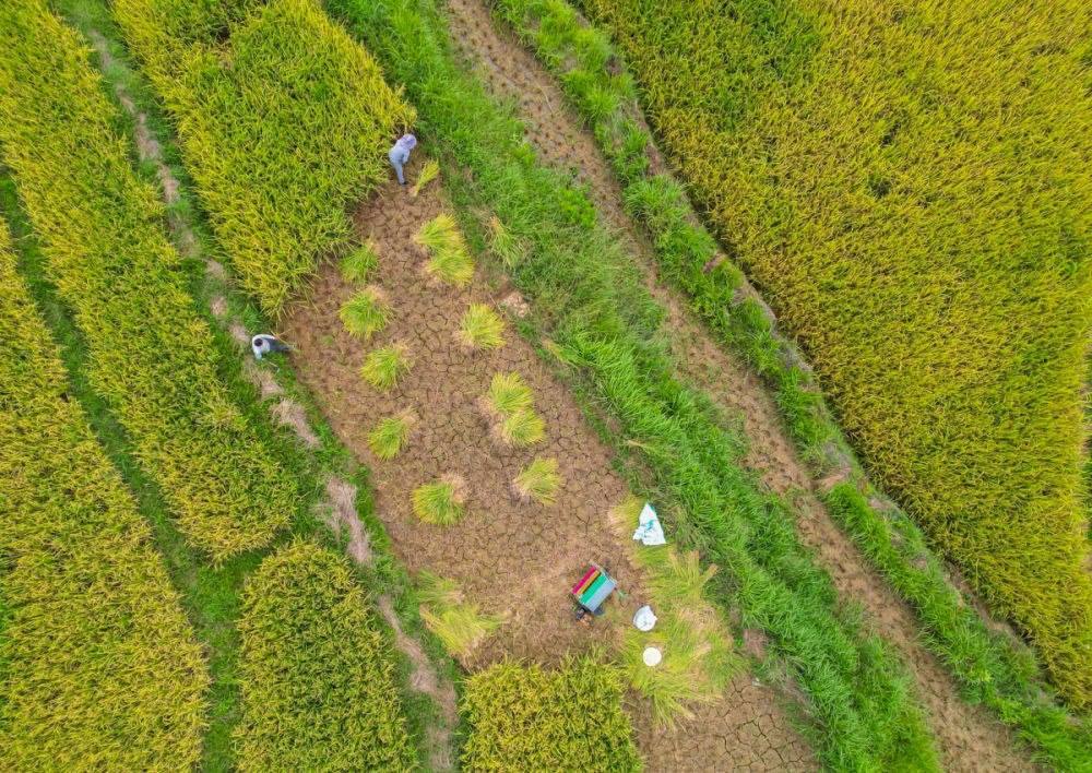 ↑2023年9月8日,貴州省黔南布依族苗族自治州羅甸縣沫陽鎮(zhèn)紅星村,農(nóng)民在收割稻谷。CICPHOTO/史傳鴻 攝