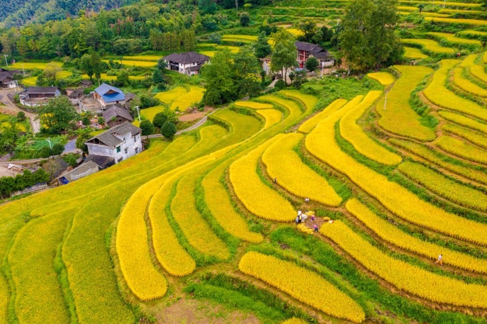 ↑2023年9月4日,湖南省東安縣舜皇山國家森林公園管理局塘家梯田,農(nóng)民在收割稻谷。CICPHOTO/嚴潔 攝
