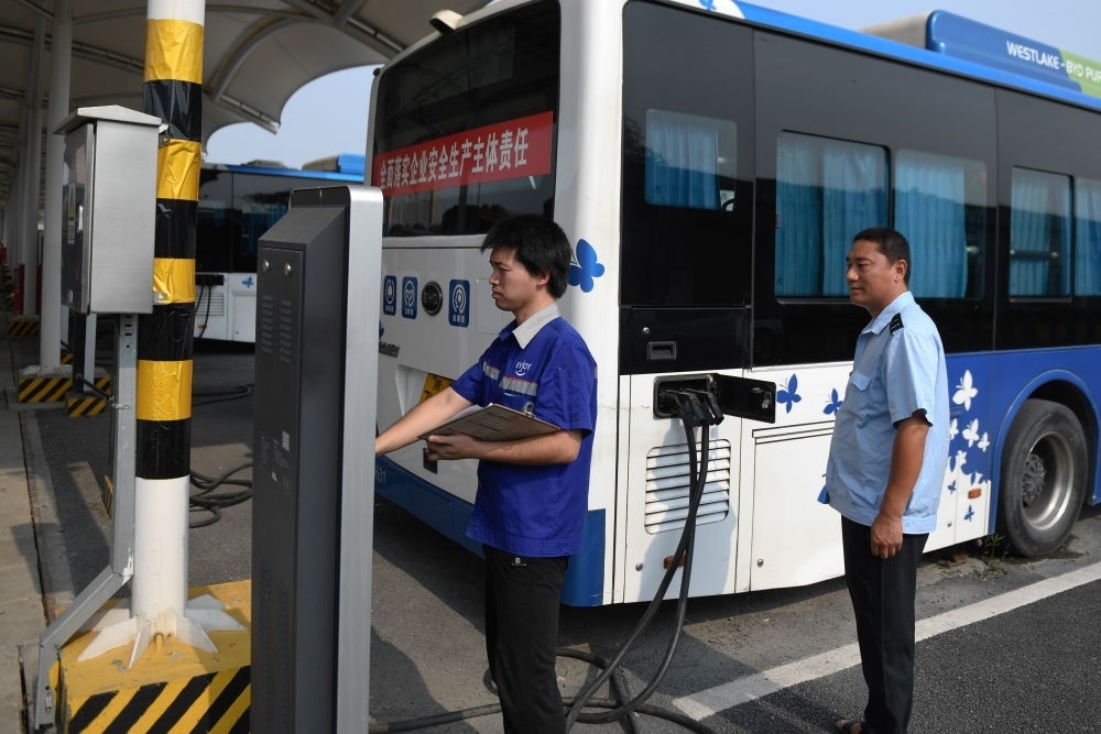 工作人員(左)在杭州公交電車公司拱康路維保站檢查純電動公交車的充電情況。新華社記者黃宗治 攝