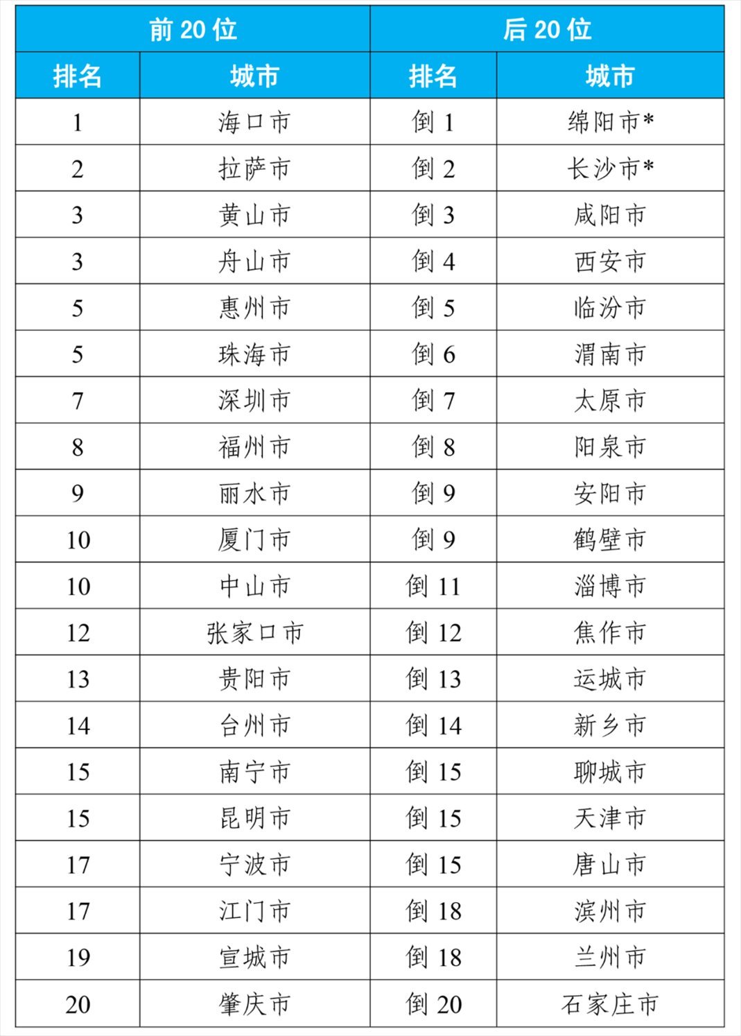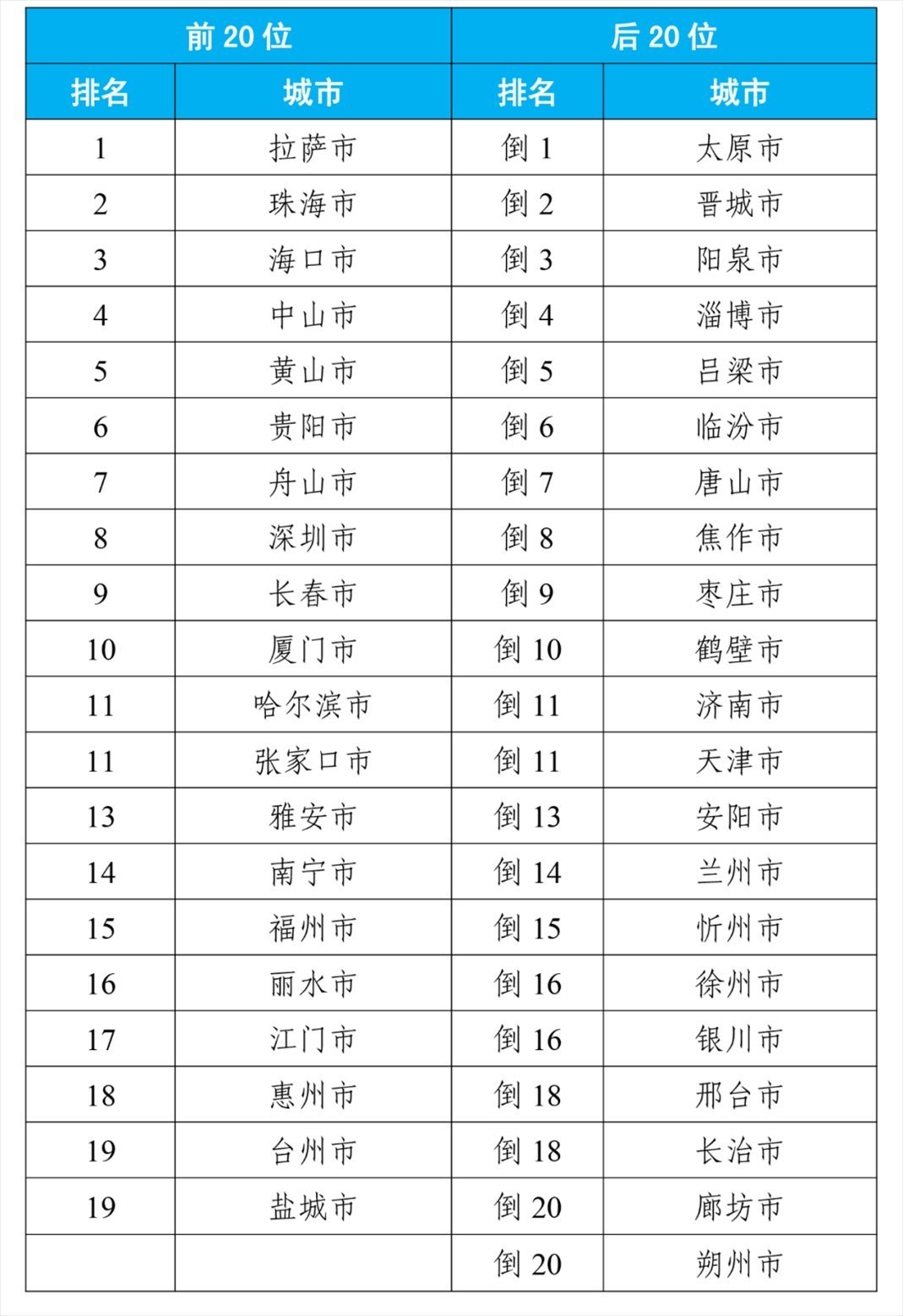 8月,168個重點城市中,空氣質量排名前20位城市依次是拉薩、珠海和??诘瘸鞘校◤牡?名至并列第19名);空氣質量排名后20位城市依次是太原、晉城和陽泉等城市(從倒數(shù)第1名至并列倒數(shù)第20名)。見附表1。