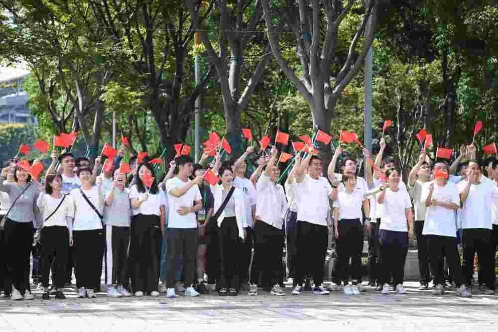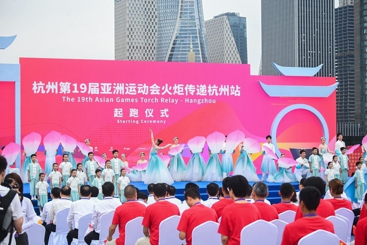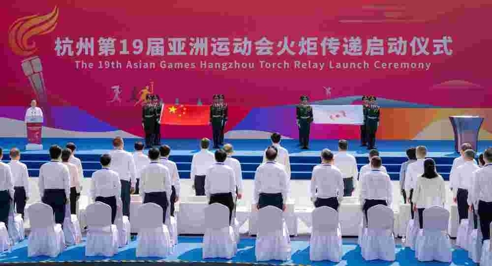 ↑這是杭州亞運(yùn)會(huì)火炬?zhèn)鬟f杭州站起跑儀式現(xiàn)場(chǎng)。