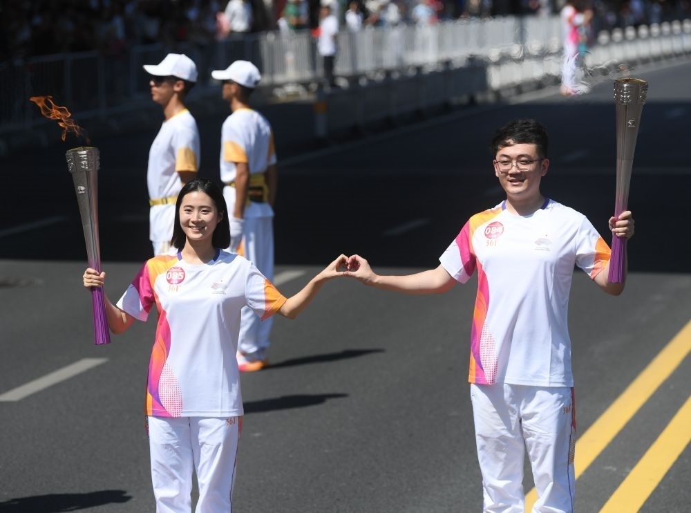 ↑火炬手王子震(右)和項(xiàng)珍珍在火炬?zhèn)鬟f中。