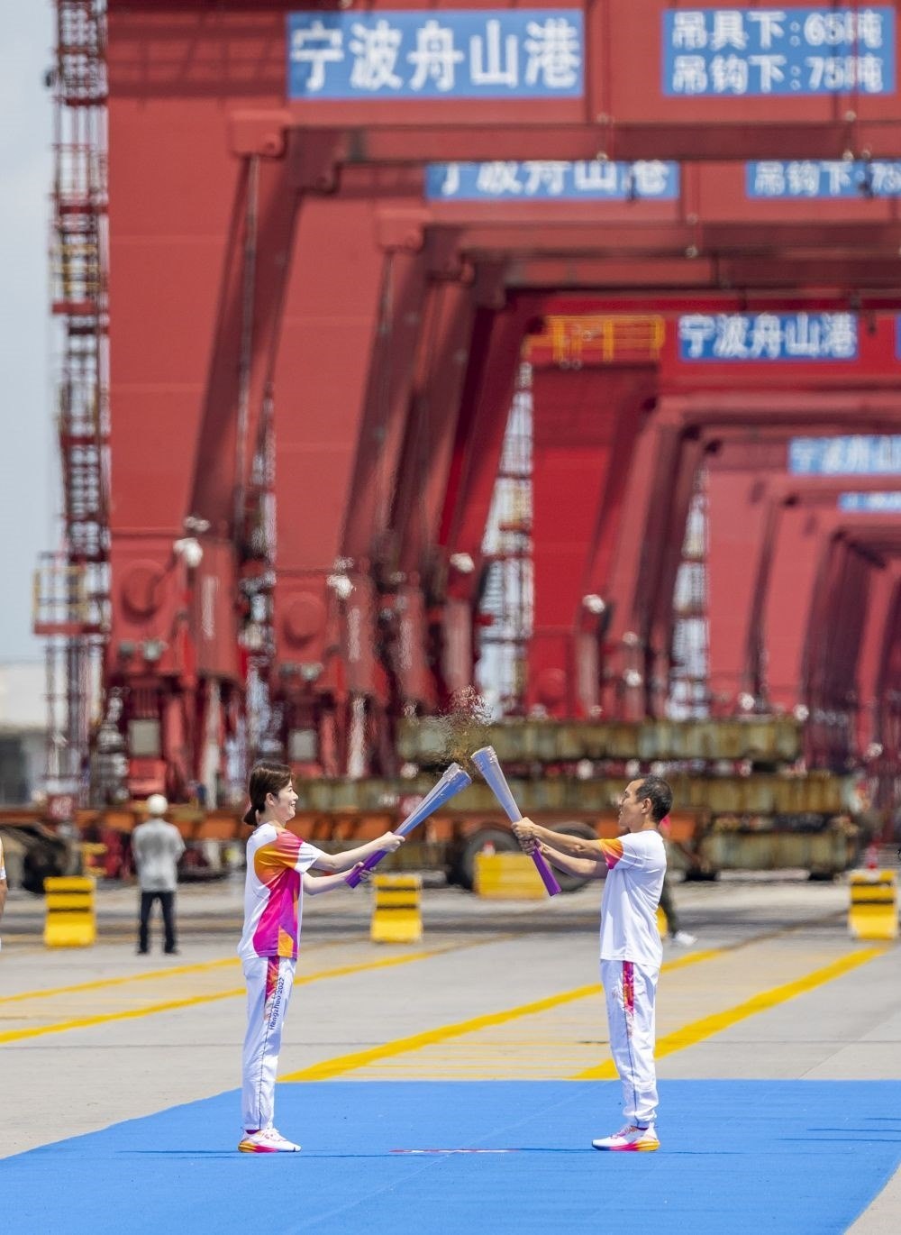 ↑火炬手鄭方(右)和施金仙在火炬?zhèn)鬟f中。
