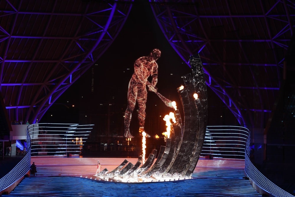中國農(nóng)歷秋分節(jié)氣,杭州奧體中心體育場“大蓮花”燈光璀璨,萬涓成水,奔涌成潮?!皵?shù)字火炬手”與游泳運(yùn)動員汪順共同點(diǎn)燃了象征亞洲大團(tuán)結(jié)的體育之火,杭州第十九屆亞運(yùn)會開幕。