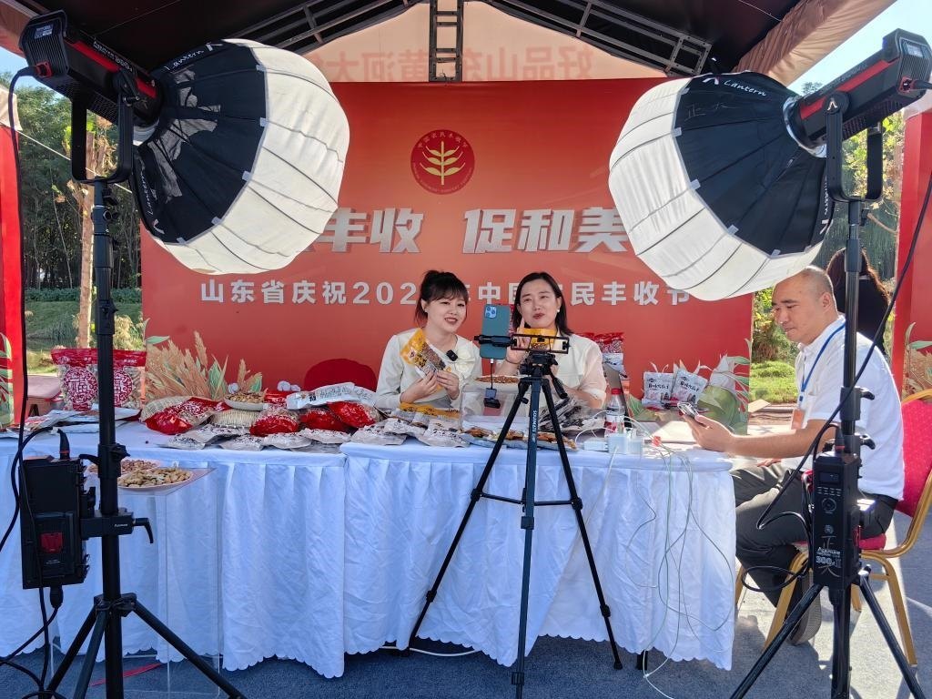 活動(dòng)現(xiàn)場(chǎng),主播在直播帶貨山東特色農(nóng)產(chǎn)品。新華社記者 張力元 攝