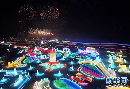 焰火在冰雪大世界園區(qū)上空綻放(無人機(jī)照片)。