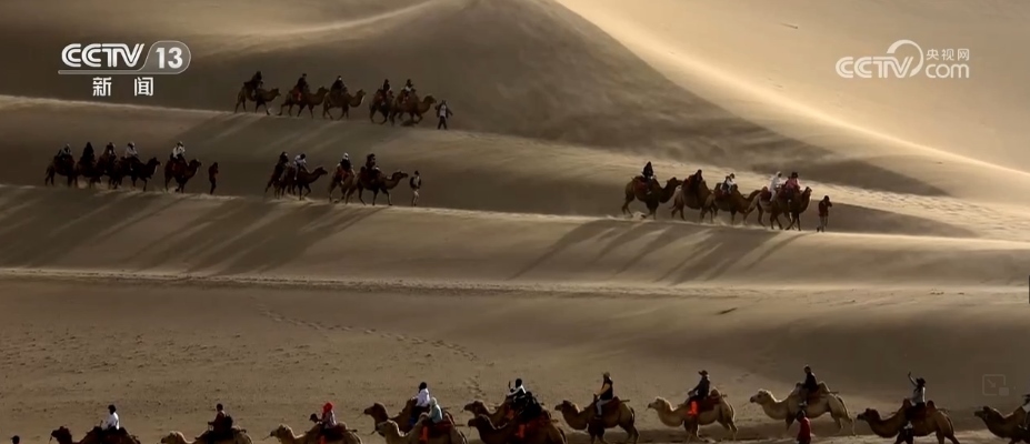 在甘肅酒泉,游客騎著駱駝在鳴沙山月牙泉景區(qū)游覽,在沙漠中體驗異域風情。