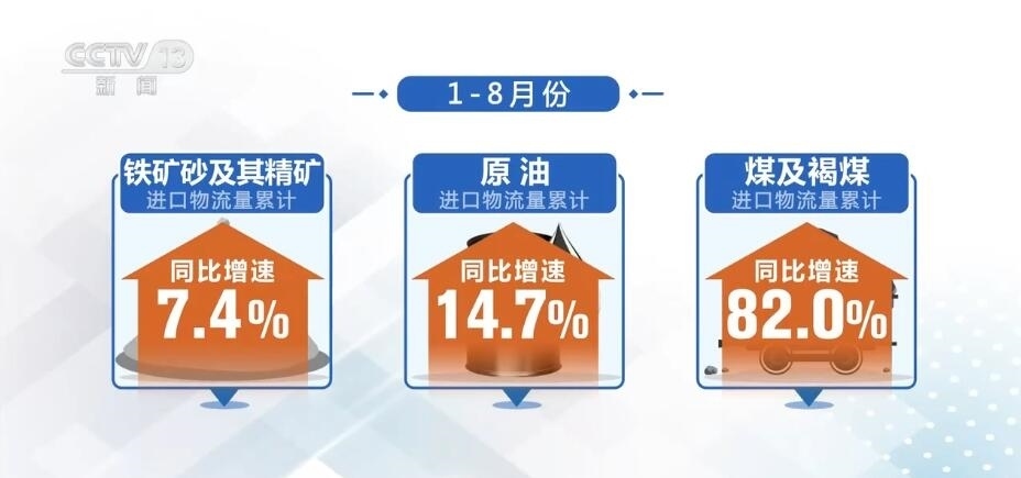 從進(jìn)口來(lái)看,隨著內(nèi)需改善,進(jìn)口物流也呈現(xiàn)量?jī)r(jià)回升。1—8月份進(jìn)口物流總額同比增長(zhǎng)14.4%,增速持續(xù)回升。從產(chǎn)品結(jié)構(gòu)看,原材料等大宗商品進(jìn)口增速有所加快,鐵礦砂及其精礦、原油、煤及褐煤進(jìn)口物流量累計(jì)同比增速分別為7.4%、14.7%、82.0%。