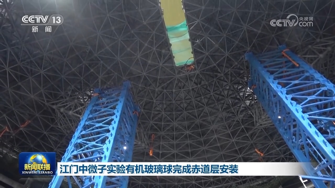央視網(wǎng)消息(新聞聯(lián)播):大科學(xué)裝置江門中微子實驗正在緊張建設(shè)中,位于地下700米的中心探測器日前完成了世界最大單體有機玻璃球赤道層的安裝,探測器整體工程過半。