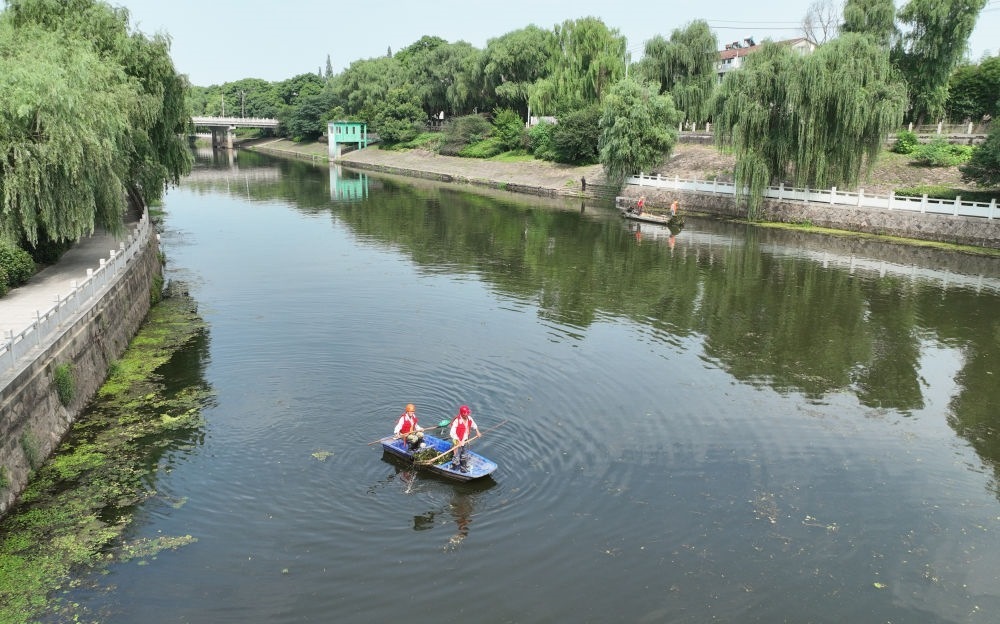 工作人員在湖州市吳興區(qū)埭溪鎮(zhèn)進(jìn)行河道保潔(6月21日攝,無人機(jī)照片)。新華社記者 翁忻旸 攝