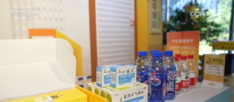 記者在北京市某防暑驛站看到,中午十二點,外賣騎手正在送單的空閑間隙里休息。這里不僅備有解熱鎮(zhèn)痛類、止瀉類、防暑類功能藥品,還有冷飲、西瓜等消暑餐食,像這樣的防暑驛站在全國有7000多個。