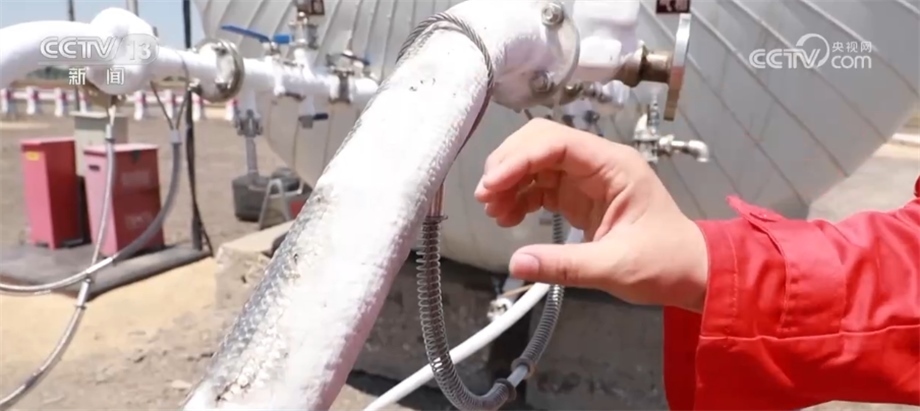 總臺記者 閆崎峰:可以看到我旁邊的這些管線上凝結了厚厚的白霜,管子里運輸?shù)木褪堑蜏匾簯B(tài)下的二氧化碳。這些二氧化碳被這些高壓泵送入距離我腳下4000多米的原油層中。加入了二氧化碳的原油會變得蓬松、流動性好,便于采集,這種方式可以提高至少18%的采收率。