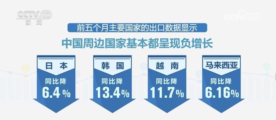 當記者查閱主要國家前5個月的進口數(shù)據(jù)時發(fā)現(xiàn),主要國家進口額普遍下降,全球需求不振持續(xù)顯現(xiàn)。而前5個月主要國家的出口數(shù)據(jù)也顯示,中國周邊國家基本都呈現(xiàn)負增長,日本同比降6.4%、韓國同比降13.4%、越南同比降11.7%、馬來西亞同比降6.16%。