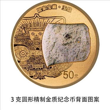 3克圓形金質(zhì)紀(jì)念幣背面圖案為玉鉞造型,襯以良渚文化相關(guān)紋飾,并刊“國(guó)家寶藏·玉鉞”字樣及面額。