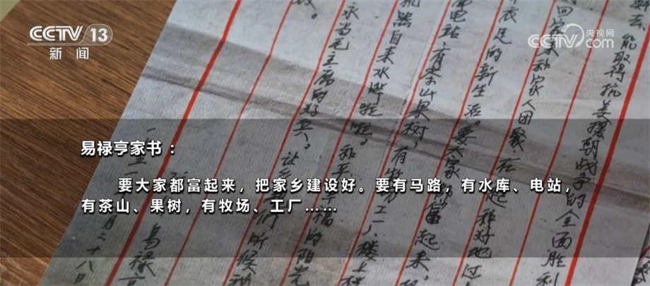 抱著與家人訣別的心情,年輕的易祿亨寫下了這封家書。除了戰(zhàn)場上的見聞和對(duì)家人的思念,他還寫下了對(duì)未來美好生活的憧憬:要大家都富起來,把家鄉(xiāng)建設(shè)好。要有馬路,有水庫、電站,有茶山果樹,有牧場、工廠……作為家中長子,瞞著父母走上戰(zhàn)場,易祿亨一直心懷愧疚。他希望通過這些文字,能讓父母理解自己的決定。