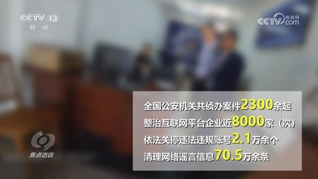 今年4月以來,公安部網(wǎng)安局部署開展為期100天的網(wǎng)絡(luò)謠言打擊整治專項(xiàng)行動(dòng),全國(guó)公安機(jī)關(guān)共偵辦案件2300余起,整治互聯(lián)網(wǎng)平臺(tái)企業(yè)近8000家(次),依法關(guān)停違法違規(guī)賬號(hào)2.1萬余個(gè),清理網(wǎng)絡(luò)謠言信息70.5萬余條,對(duì)網(wǎng)絡(luò)謠言違法犯罪形成強(qiáng)大震懾。