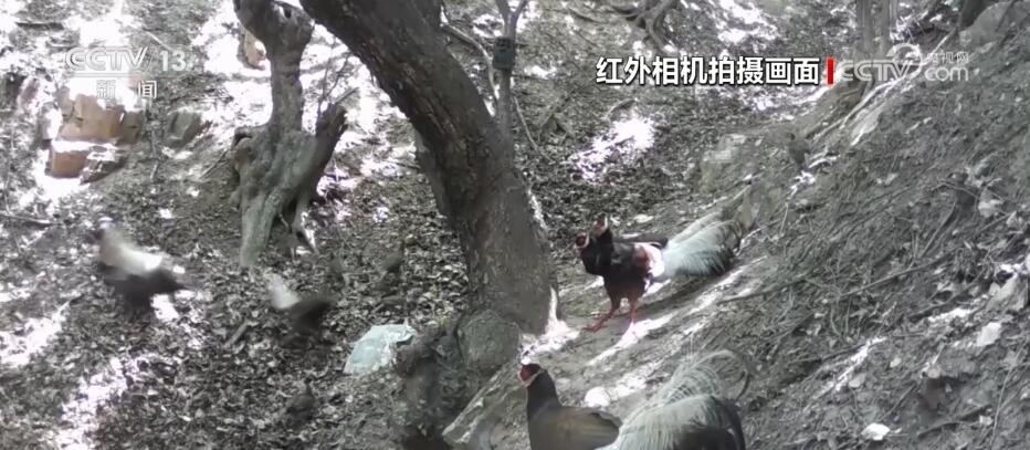 近日,在山西呂梁的孝義市國有林場,紅外相機記錄到國家一級保護野生動物褐馬雞最大種群。畫面中,先是兩群褐馬雞在兩棵老樹下覓食玩耍,兩個樹洞內(nèi)積有雨水,它們不斷地前往飲水補給。突然,一只落單的成年褐馬雞入侵,遭到領(lǐng)地一只雄性褐馬雞的追逐驅(qū)趕。不同角度的紅外相機還捕捉到褐馬雞好奇對視相機、幼崽上樹打鬧等趣味十足的珍貴影像。