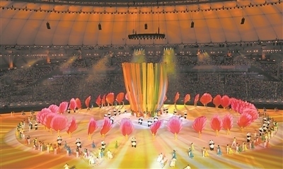 開幕式上,“太陽(yáng)神鳥”穿越時(shí)空翩飛而至,4只神鳥圍繞旋轉(zhuǎn)的太陽(yáng)飛翔。12道金色光芒漸次點(diǎn)亮,點(diǎn)亮了整個(gè)體育場(chǎng)。