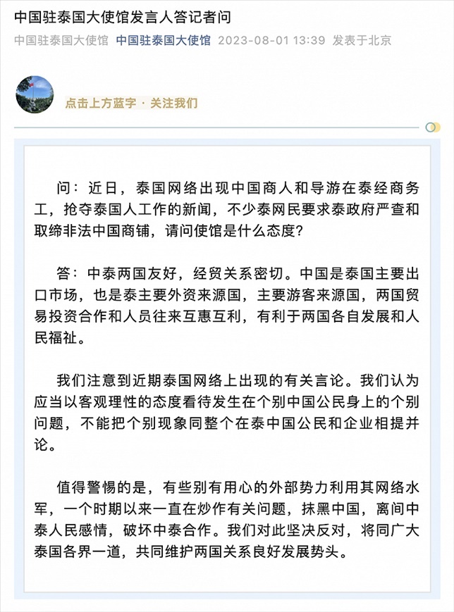 ·中國商人和導(dǎo)游在泰搶奪泰國人工作?泰網(wǎng)民要求嚴(yán)查?中使館回應(yīng)。