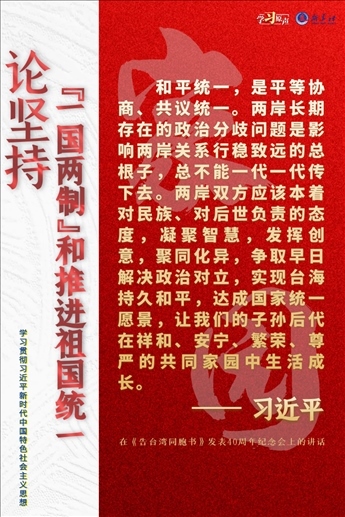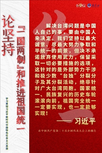 解決臺(tái)灣問題、實(shí)現(xiàn)祖國完全統(tǒng)一,是中國共產(chǎn)黨矢志不渝的歷史任務(wù),是全體中華兒女的共同愿望,是實(shí)現(xiàn)中華民族偉大復(fù)興的必然要求。必須堅(jiān)持貫徹新時(shí)代黨解決臺(tái)灣問題的總體方略,牢牢把握兩岸關(guān)系主導(dǎo)權(quán)和主動(dòng)權(quán),堅(jiān)定不移推進(jìn)祖國統(tǒng)一大業(yè)。