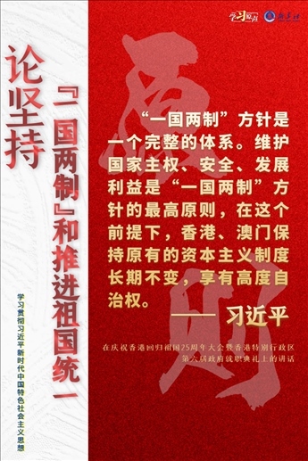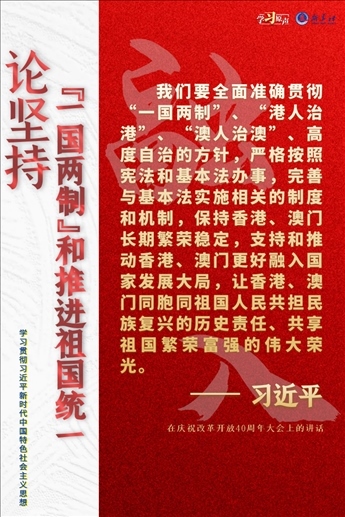 “一國兩制”是黨領(lǐng)導(dǎo)人民實(shí)現(xiàn)祖國和平統(tǒng)一的一項(xiàng)重要制度,是國家的一項(xiàng)基本國策。中國特色社會(huì)主義進(jìn)入了新時(shí)代,意味著“一國兩制”事業(yè)也進(jìn)入了新時(shí)代。不斷推進(jìn)“一國兩制”在香港、澳門的成功實(shí)踐,是中華民族偉大復(fù)興歷史進(jìn)程的重要組成部分。