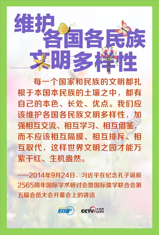 人類(lèi)文明多樣性賦予這個(gè)世界姹紫嫣紅的色彩,多樣帶來(lái)交流,交流孕育融合,融合產(chǎn)生進(jìn)步。長(zhǎng)期以來(lái),習(xí)近平主席在不同場(chǎng)合多次倡導(dǎo)尊重世界文明多樣性,推動(dòng)不同文明交流對(duì)話(huà)、和平共處、和諧共生。讓我們一起來(lái)學(xué)習(xí)。