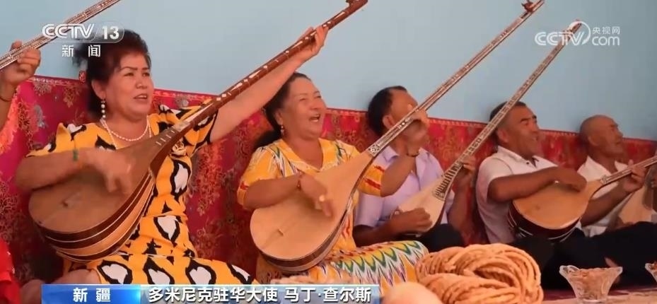 駐華使節(jié)們走進(jìn)喀什古城的街市巷陌,感受當(dāng)?shù)鬲毺氐拿褡逦幕?;在克孜爾千佛洞,領(lǐng)略跨越千年的石窟藝術(shù);來到新疆民間手工樂器制作第一村庫車市新和縣加依村,同當(dāng)?shù)匕傩找黄疠d歌載舞;觀看非遺項目十二木卡姆等一系列活動,讓使節(jié)們感嘆,新疆少數(shù)民族傳統(tǒng)文化和生活習(xí)俗得到了充分保護(hù)。